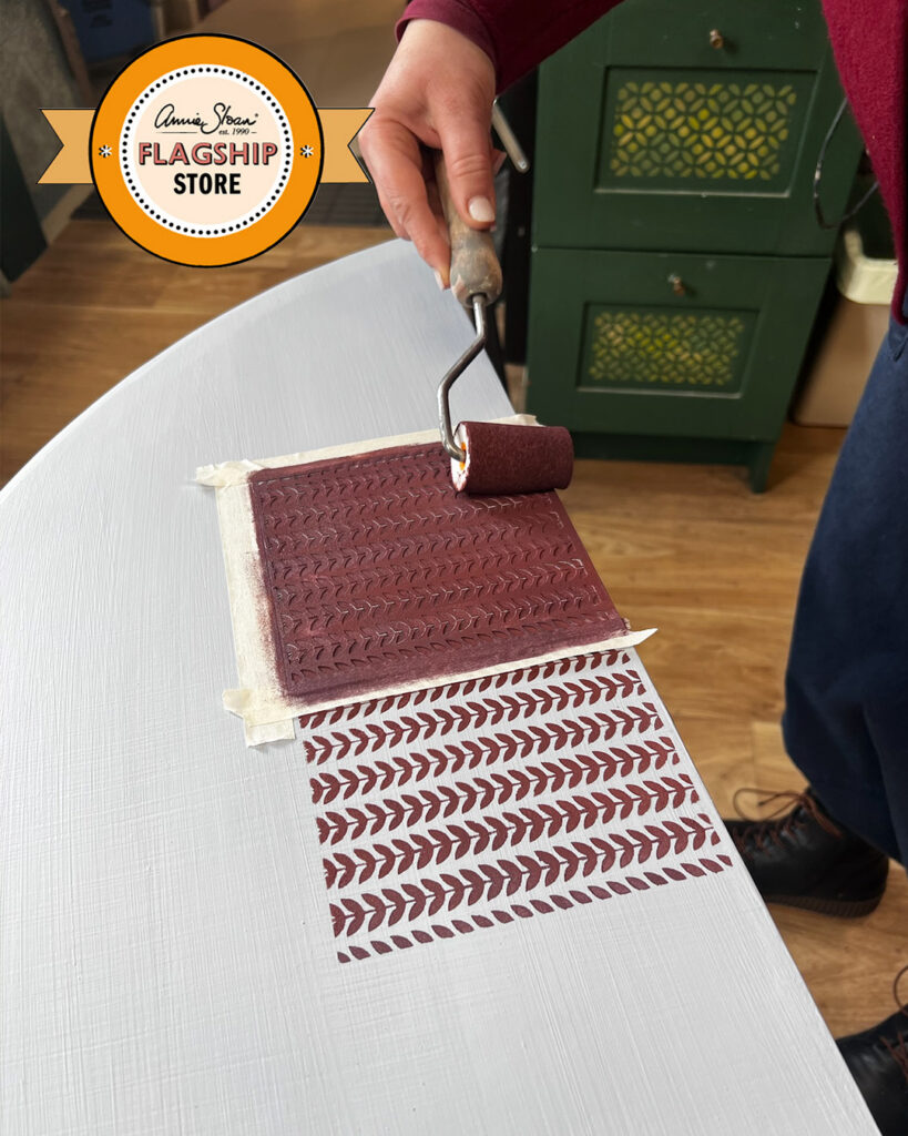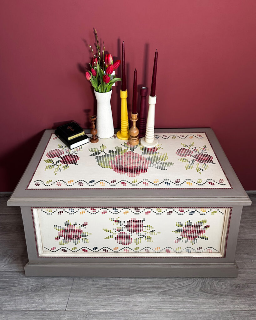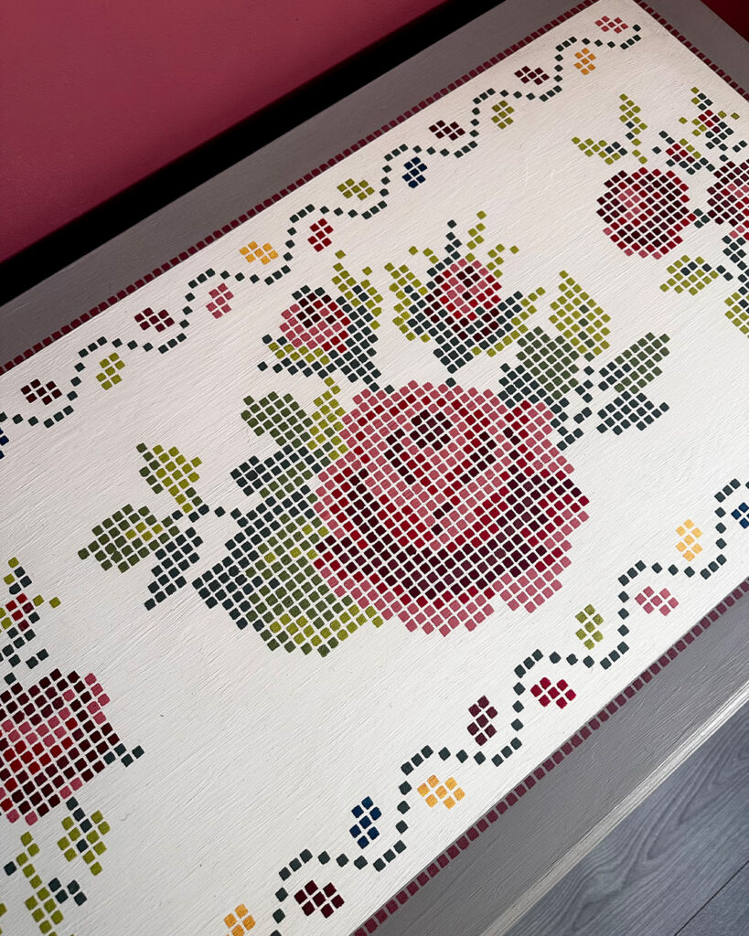 Adriana painted her dowry chest in Old Ochre, outlined with Coco, creating a light base to symbolises lengthening spring days. Working meticulously on a simple grid stencil, Adriana recreated the traditional rose embroidery motifs commonly found in the Romanian woven carpets and embroidered textiles, including the iconic blouses.