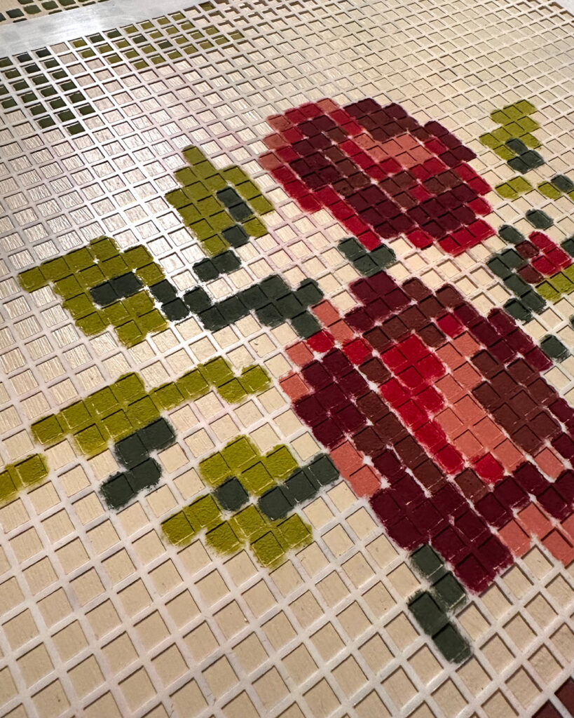 The colour palette included Emperor’s Silk, Scandinavian Pink, Primer Red, Burgundy, Tilton, Olive, Aubusson Blue, and Firle, applied with a fine brush. Each square was stencilled twice to achieve a subtle three-dimensional effect – a process that took two weeks!