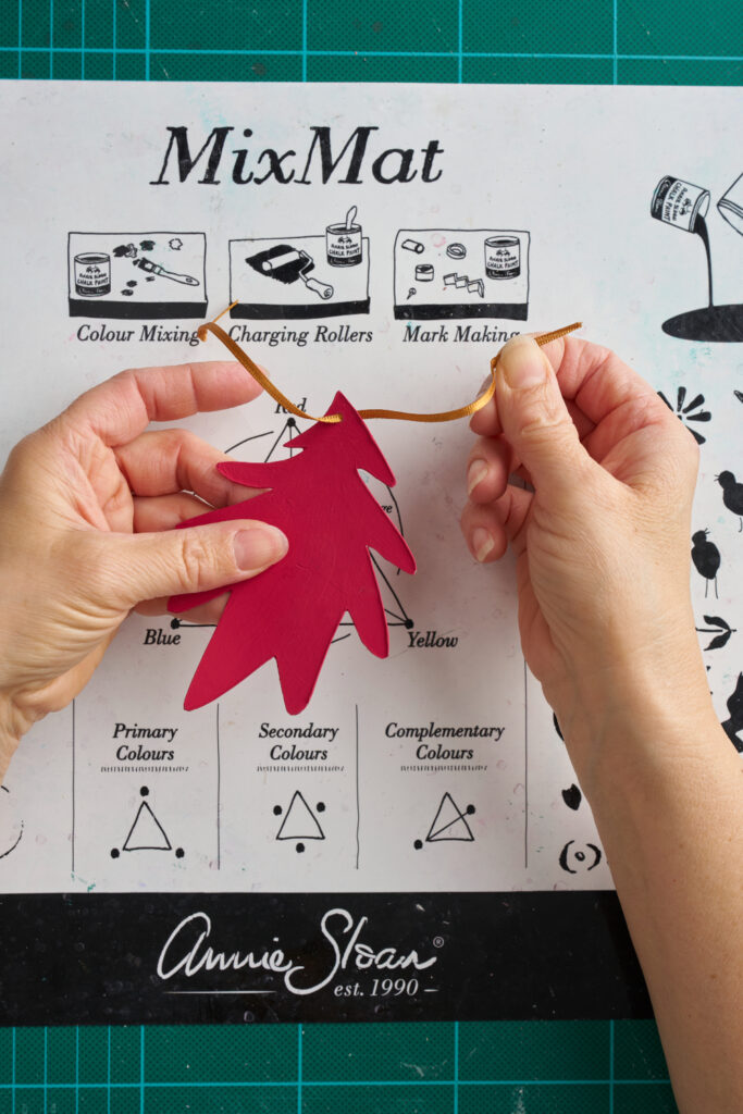 Cut small pieces of the thinner ribbon, cord or embroidery thread to roughly 20cm in length and thread through the hole you have made in each decoration.