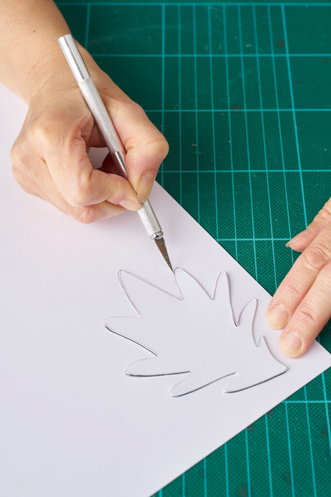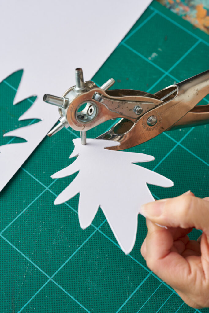 Carefully cut out the shapes for your garland using a craft knife or scissors. Use a cutting mat to protect your surfaces. Remember, the lighter the cardboard the easier it will be