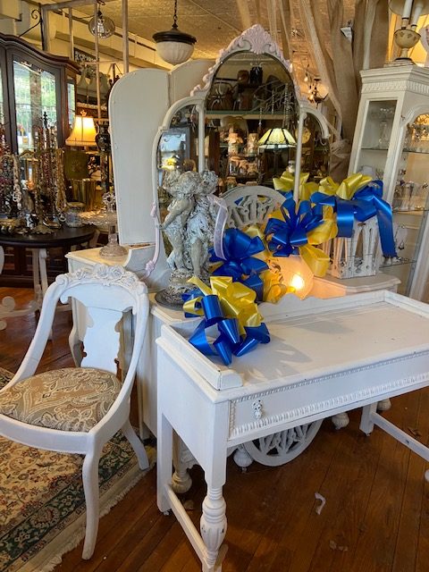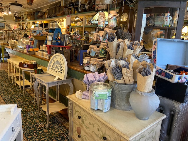 You will discover an ever-changing selection of up-cycled painted furniture, handcraft, gifts & antiques, vintage clothing, costume jewelry. We provide chalk paint, finishes & supplies, decoupage tissue, transfers and stencils for DIY. We offer workshops in chalk painting, mosaics and stained glass, fundraising and music events. Our town has several parades and festivals that bring lively celebration to Main Street, and we are always open and hopping during these events. People who stop in enjoy visiting our interesting garden and petting our friendly goats. We have a very inviting atmosphere, and our visitors enjoy learning the history of our building.