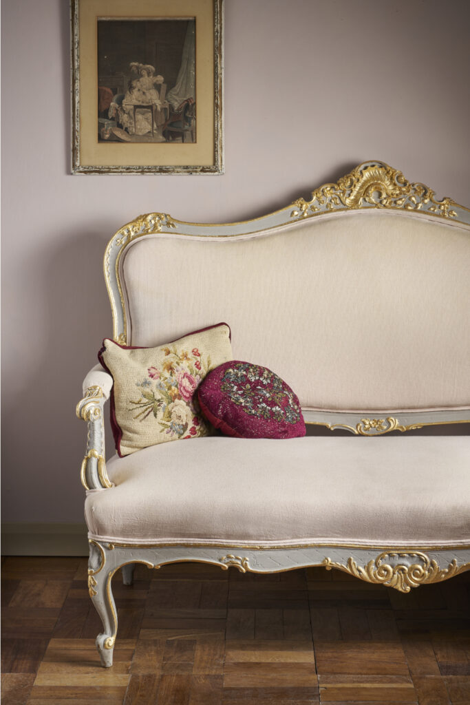 Reproduction French canapé sofas – like the one Annie painted in Annie Sloan’s Colourful Living – can often be found at auctions or sales at reasonable prices (though they may need reupholstering). Their carved frames, from shell motifs to delicate florals, look stunning when gilded using Metal Leaf in Imitation Gold.