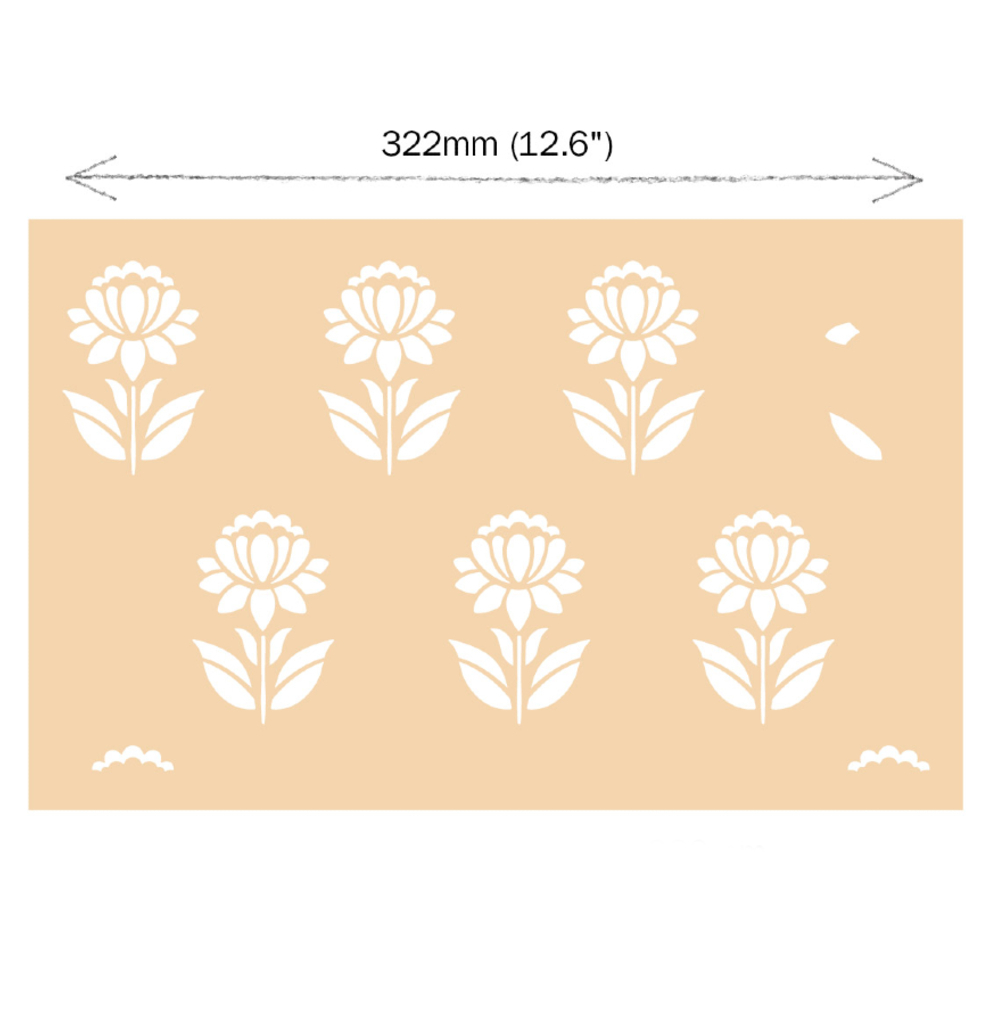 Wzory szablonów zostały zainspirowane wizytami Annie w Radżastanie w Indiach, gdzie organizujemy nasze warsztaty malarskie. Inspiracją dla tej kolekcji była wizyta w sali Lotus Room w pałacu miejskim w Udaipurze, której ściany od podłogi do sufitu pokryte są kolorowymi, ręcznie malowanymi wzorami. Gdy tylko Annie zobaczyła graficzne kwiaty i misterne obramowania, wiedziała, że będą one wspaniałymi szablonami.