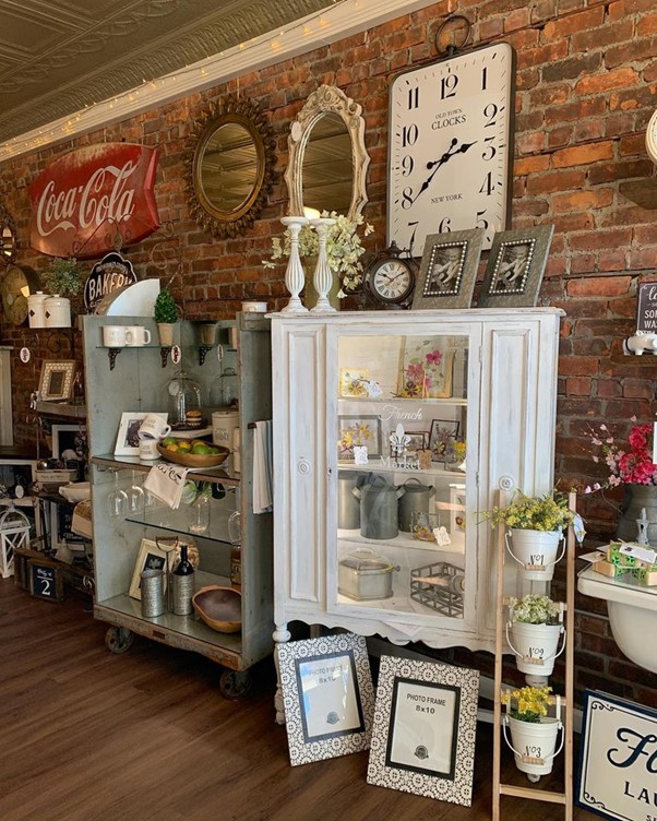 A vintage home décor mom and pop shop. While we do sell new items such as blankets, candles, pillows and frames and many other home accents, but our true passion is upcycling and re-purposing old vintage furniture and bringing it back to life for our customers to enjoy. Every piece has a journey, and every journey tells a story. The older the piece, the better the history, and our customers love hearing the story on how we find our pieces so when they bring a piece home, they too can share the story with family and friends. Examples of some of the upcycled furniture in the shop include old radios, Victrolas and old television sets that have been made into rolling bars. Other finds include Coca-Cola and Pepsi memorabilia, a wooden barber chair and old refrigerators, fireplace mantels, rocking chairs, desks, telephone booths and tables.