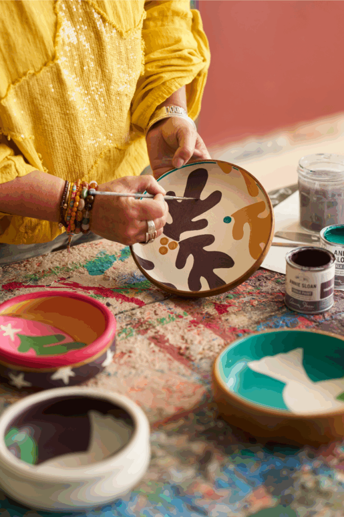 You will be painting a large and small decorative plate and nut bowl with a Matisse-inspired Christmas theme, designed by Annie herself.