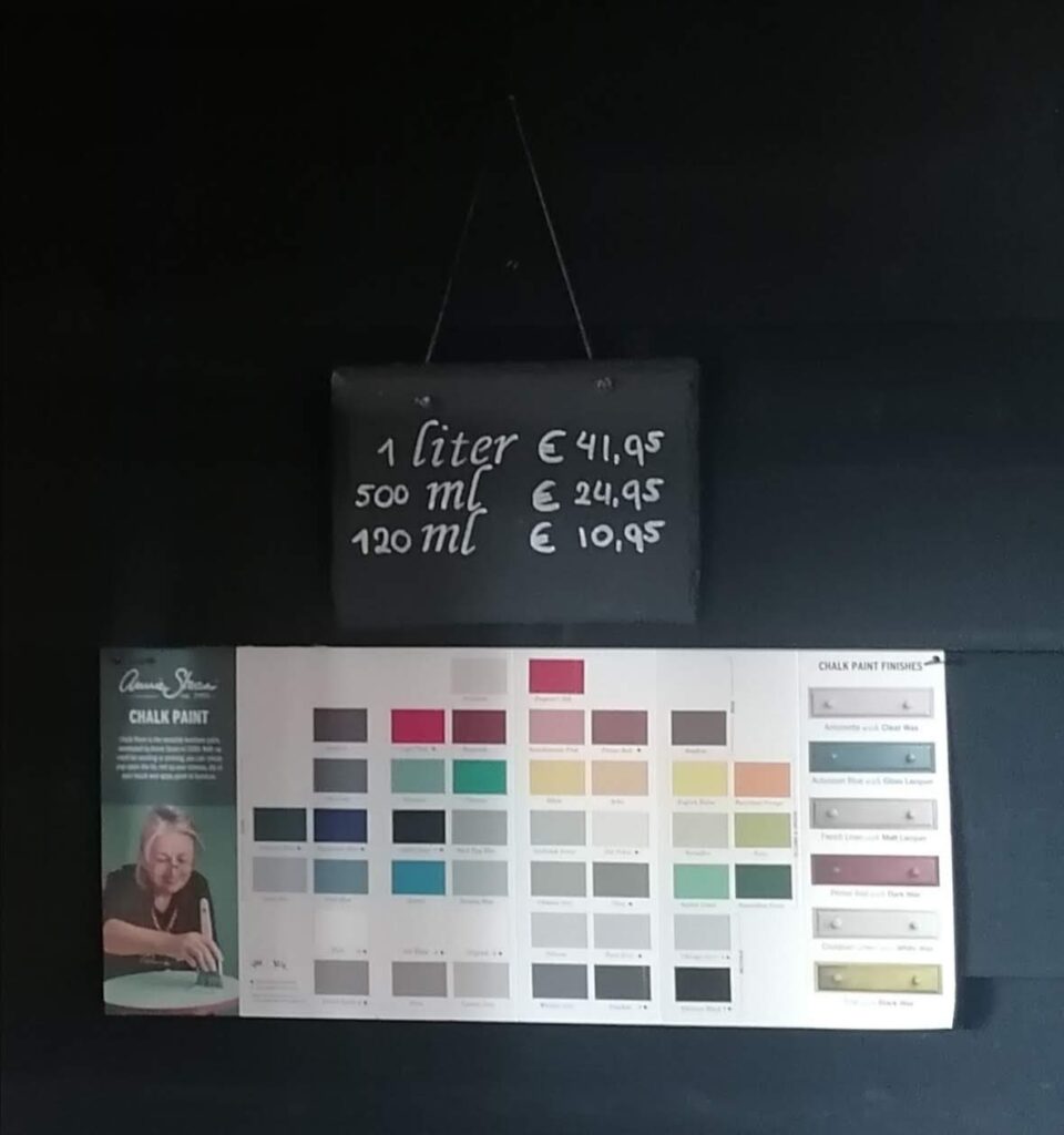 In mijn aTelier verkoop ik alle kleuren Annie Sloan Chalk Paint, wax, lak en kwasten. Wall Paint, Satin Paint, stencils, decoupage etc. kan ik op bestelling verzorgen. Uiteraard voorzie ik je graag van (kleur)advies!