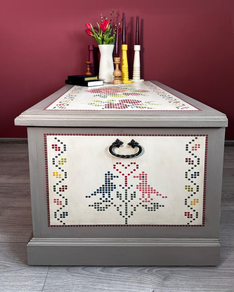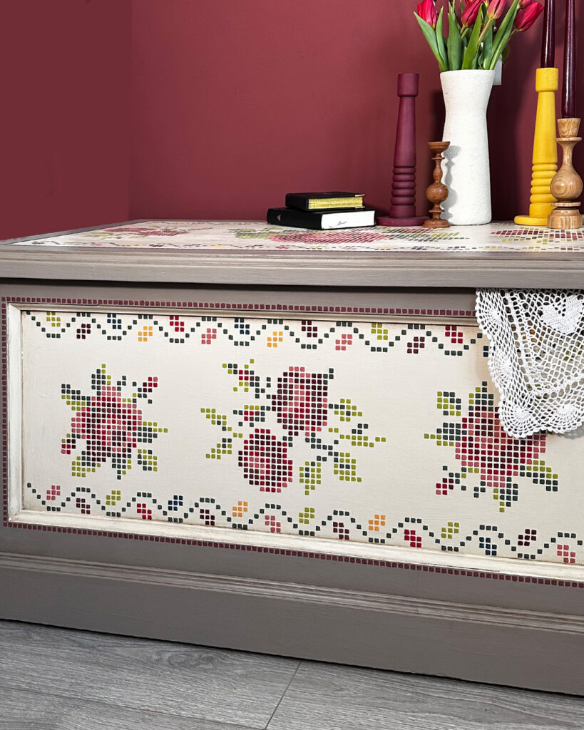 Adriana painted her dowry chest in Old Ochre, outlined with Coco, creating a light base to symbolises lengthening spring days. Working meticulously on a simple grid stencil, Adriana recreated the traditional rose embroidery motifs commonly found in the Romanian woven carpets and embroidered textiles, including the iconic blouses.
