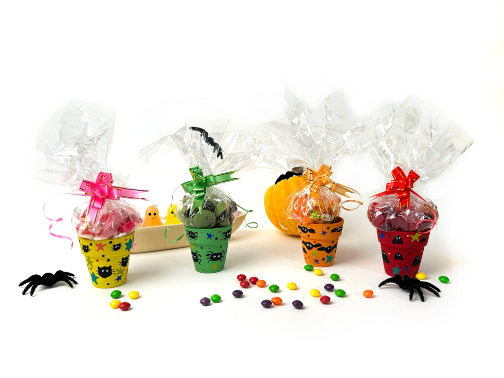 Now for the best part, filling up your spooky pots. Wrap some sweets in cellophane, tie them up with a ribbon and pop them inside. They make the perfect Halloween surprise.Once the treats are eaten re-use the pots. Add some compost and plant microgreen seeds. In a few days, you’ll have fresh greens to enjoy in salads and sandwiches.