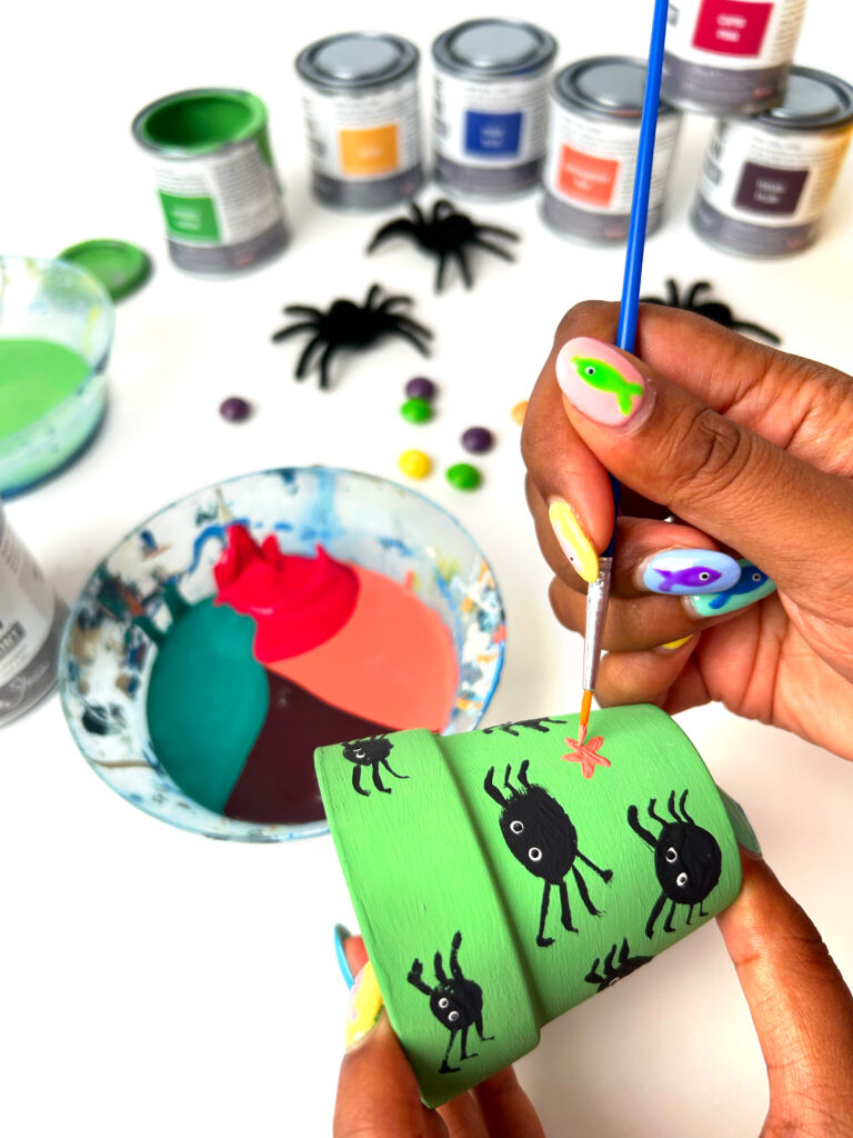 Time to bring your pots to life. Dip your brush into Athenian Black and mark out where you’d like your spooky shapes to go. If you prefer, you can lightly draw them on with a pencil first. Now paint on some classic Halloween silhouettes. Think ghosts, cats, bats or even a creepy spider.
