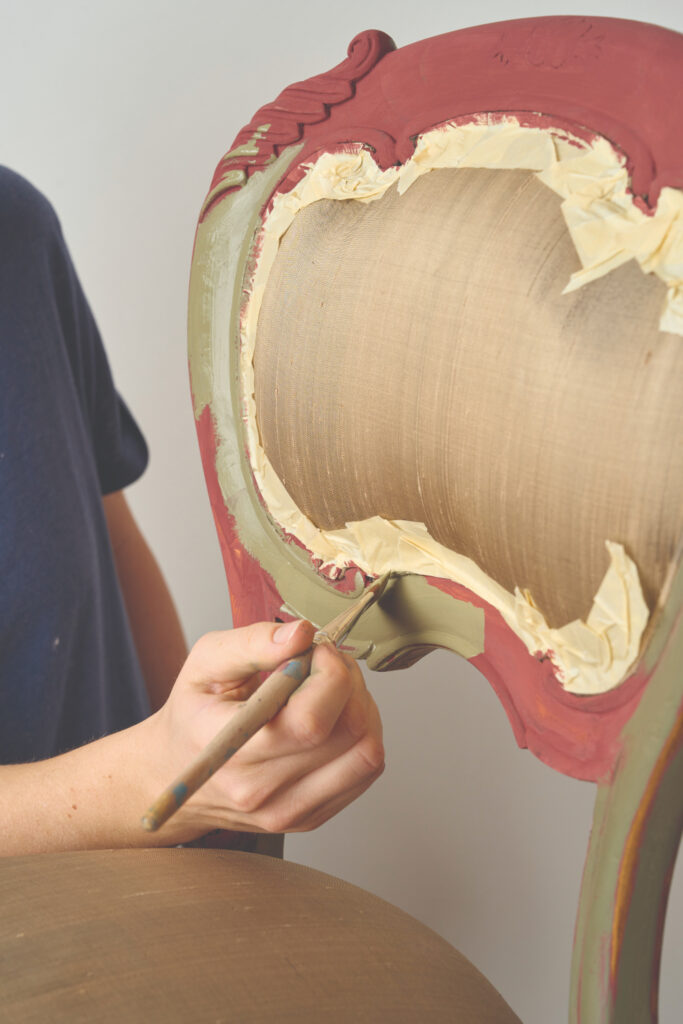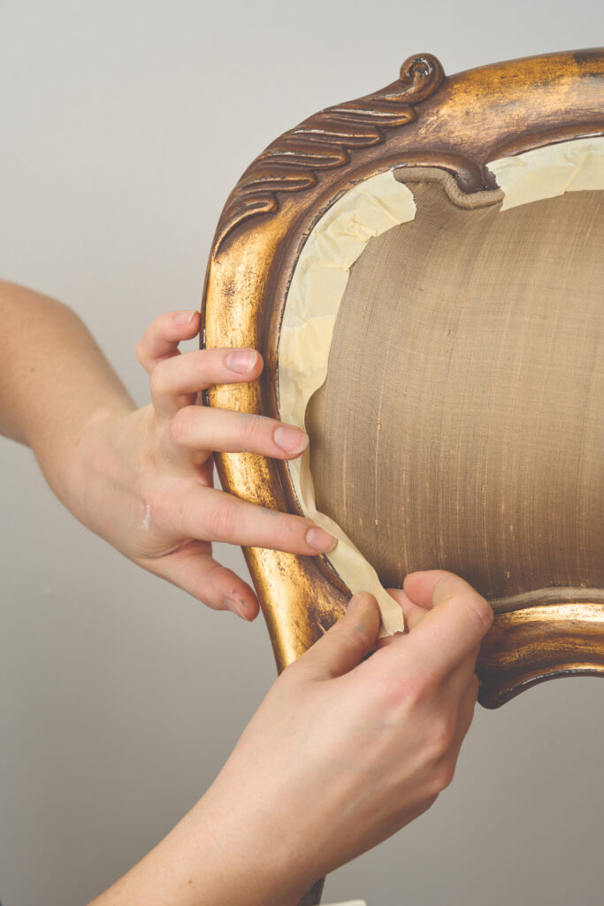 Prepare the chair by taping over the edges of the fabric using masking tape, so you don’t get paint on it. Use small pieces to get close to the curved edge.