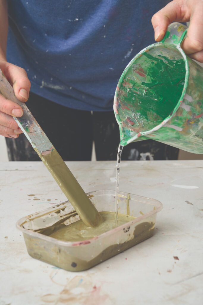 Water down Chalk Paint in Olive until it’s the consistency of single cream. It’s better if this coat is a bit thinner so it’s easier to sand down.