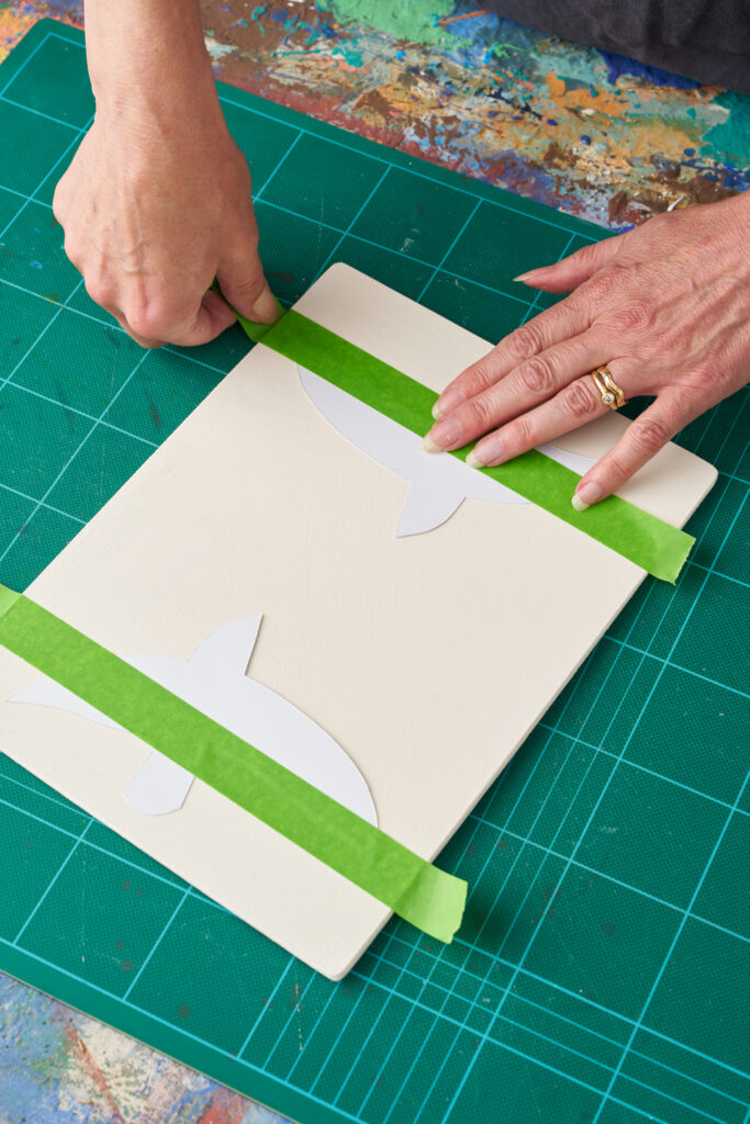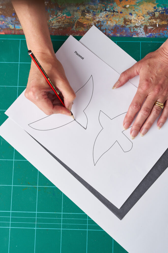 Attach the bird shapes to both sides of your placemat with masking tape. Roller one side in 50:50 Capri Pink and Original. Repeat on the other side with Capri Pink. Remove the bird shapes and leave to dry.