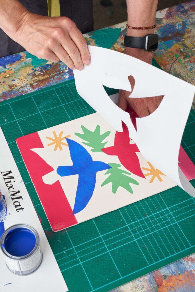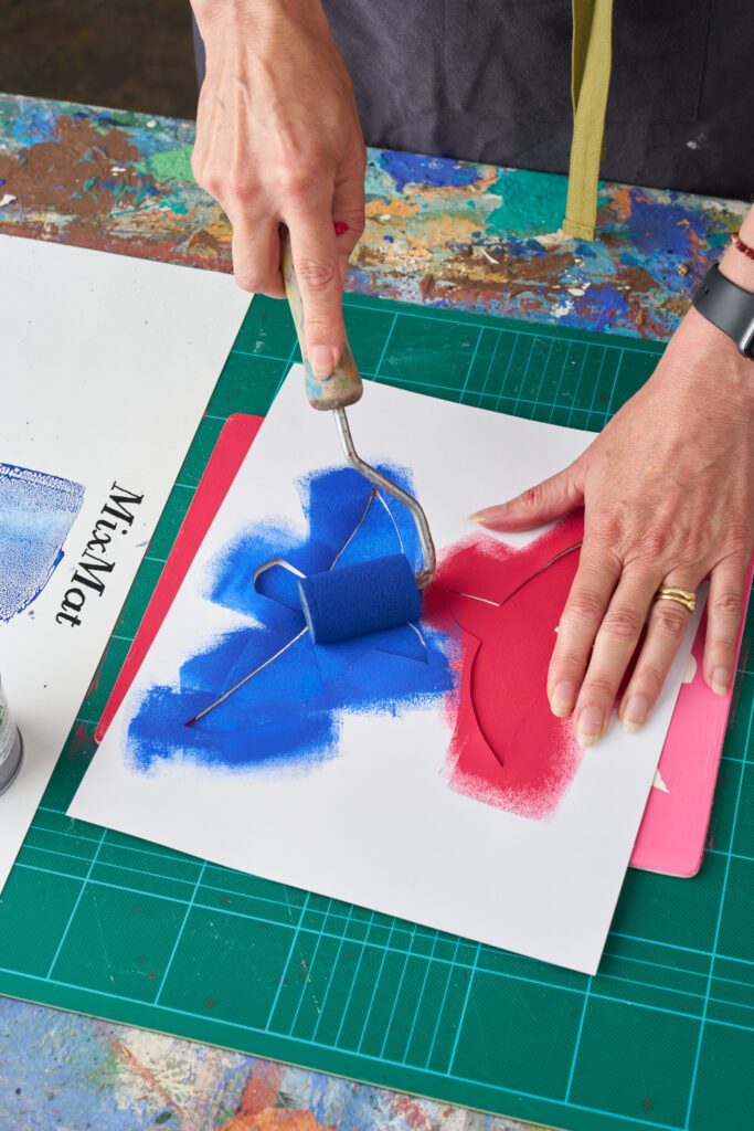 Use a MixMat to mix your paint. Try not to water your paint down too much or press down too hard when using a roller to avoid the colours bleeding under the edges of your stencil. Test on paper first to check you have the right consistency.